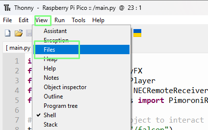 We’re using Thonny, an easy to use Python editor for this project. With Thonny we can write code directly onto Tiny FX W, and move files to the device. In this first section we will write the code that reacts to our remote control input. Then we will use Thonny to transfer an audio file that we wish to play as part of the diorama.