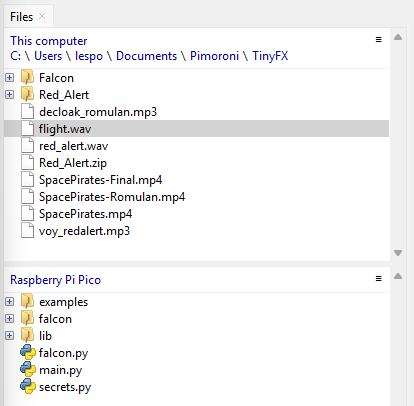 - Note that the Files window is split into two areas. At the top are the files on our computer. At the bottom are the files on the Tiny FX W (Raspberry Pi Pico).