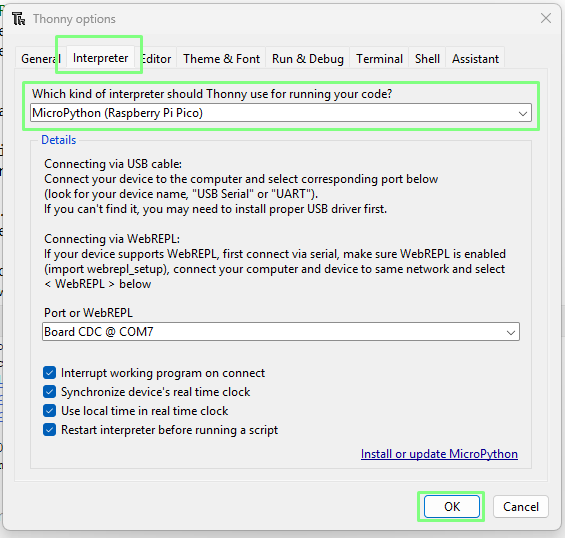 - Click on Interpreter, and select MicroPython (Raspberry Pi Pico) from the dropdown. Click OK to close the dialog box.