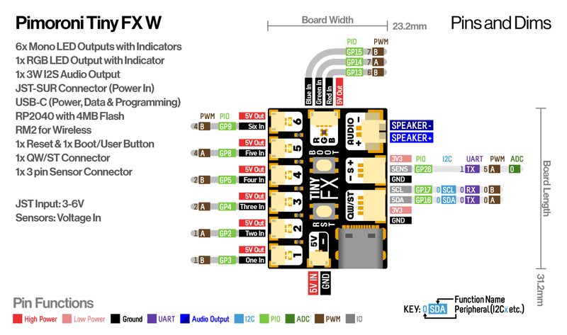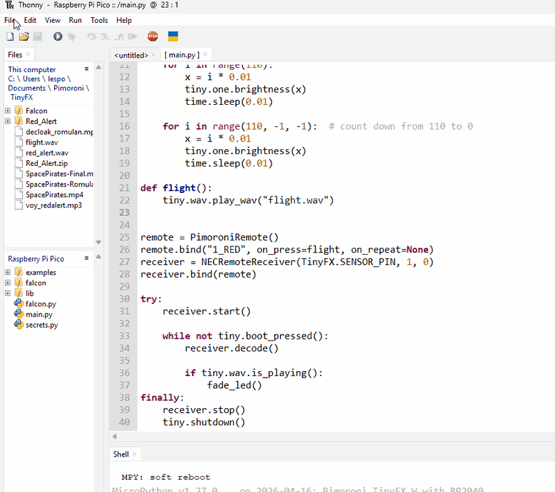 import time from tiny_fx import TinyFX from picofx import MonoPlayer from aye_arr.nec import NECRemoteReceiver from aye_arr.nec.remotes import PimoroniRemote - Create an object to easily interact with TinyFX W and to specify where sound effects will be stored. We will get to that part later.