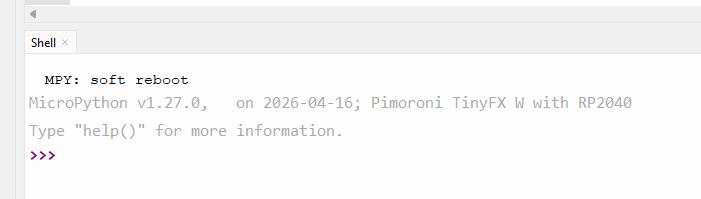 - The Python Shell will update and confirm that we can communicate with Tiny FX W. If nothing happens, click on Stop to force the board to restart and reconnect. If the issue remains, try another USB cable.